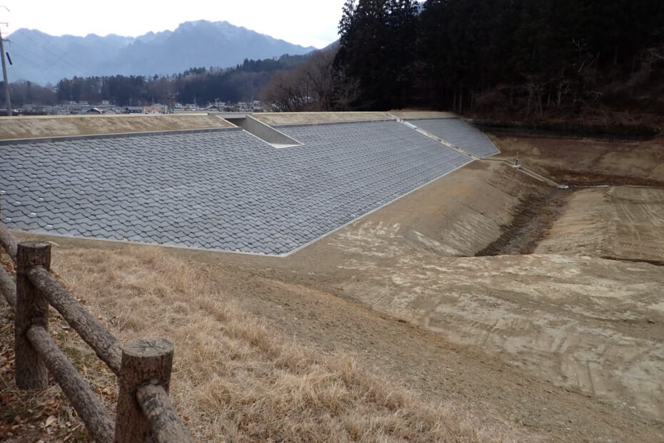 また盛土時にジオテキスタイルを敷設することでより強固な堤体を築堤しました。